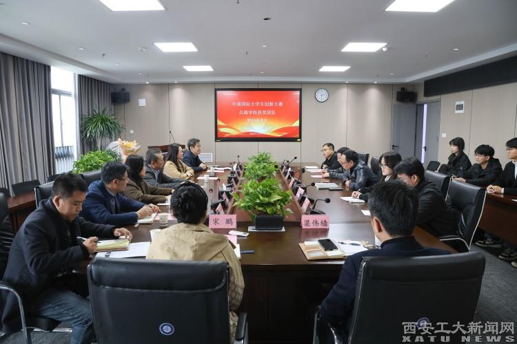 侯成义代表学校对团队表示慰问和祝贺。他指出,项目金奖突破难能可贵,为学校师生树立了榜样,各相关部门认真总结经验,加强协作,以学校目标责任改革为契机,建立相关绩效评价机制,强化结果运用,持续做好创新大赛后续策划和组织工作,要以大赛为牵引,提升学校科创水平,做好拔尖人才培养,提升创新型人才培养质量。