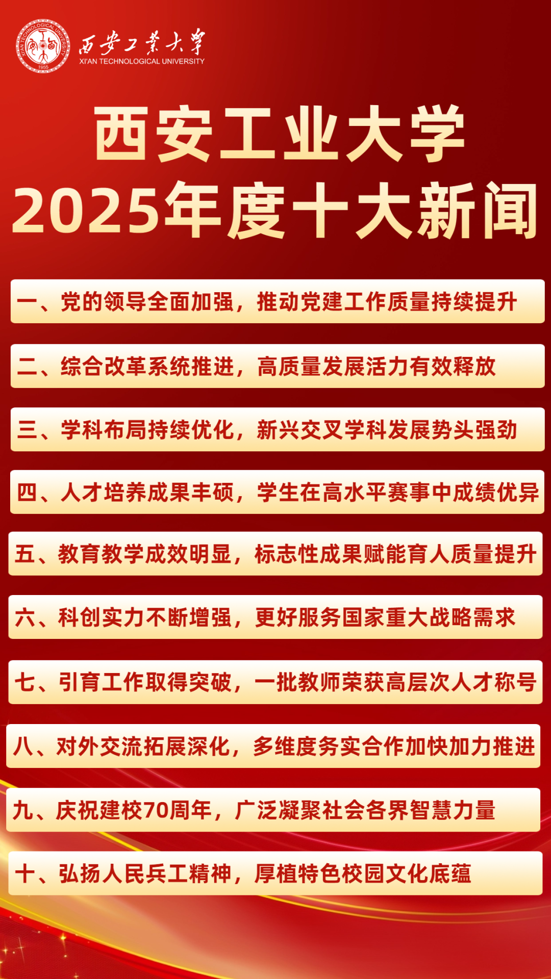 2025年的奋斗足迹已刻入时光,2026年的崭新画卷正徐徐展开。西安工业大学将以更加昂扬的姿态,扎根军工、矢志创新,在建设军工特色鲜明的高水平研究型大学征程中续写华章,为强国建设、民族复兴贡献西工力量!