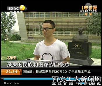 9月3日,在纪念中国抗日战争胜利暨世界反法西斯战争胜利70周年这一天,我校组织2015级军训师生一起观看了“胜利日大阅兵”的实况转播。当晚,陕西广播电视台都市青春频道“都市快报”栏目、西安广播电视台2套 “新闻零距离” 栏目以及西安广播电视台1套 “西安夜新闻” 栏目,分别播出我校组织师生观阅兵仪式活动的新闻。9月4日《陕西日报》也对我校这项活动作了报道。