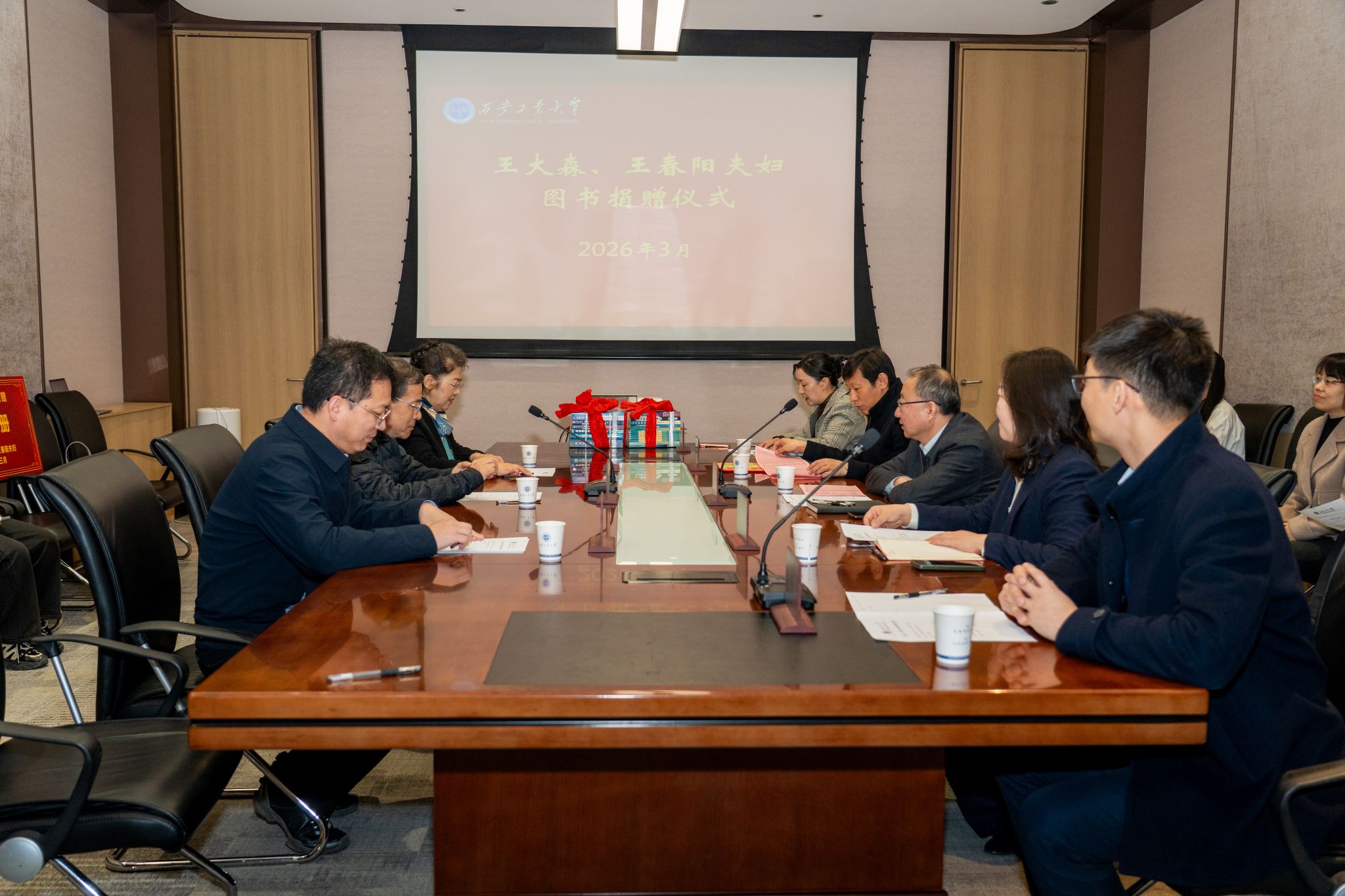 3月18日,王大森、王春阳夫妇图书捐赠仪式在未央校区图书馆第一会议室举行。副校长何春水,光电工程学院党委书记周顺、院长朱学亮,外联处(校友总会办公室)处长杨琳,图书馆馆长容晓峰等相关部门工作人员出席仪式。仪式由外联处副处长周黎萍主持。