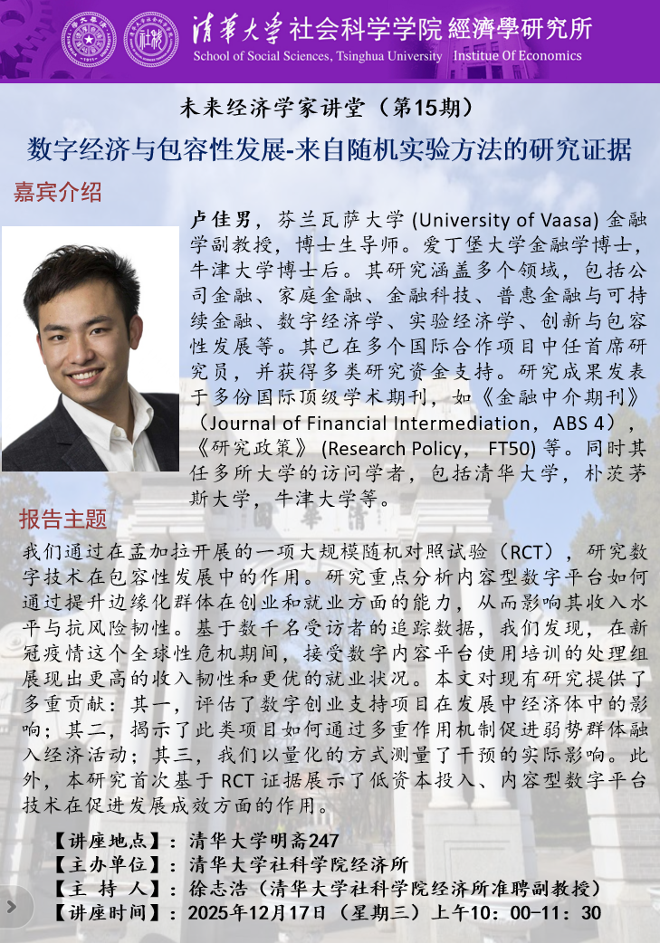 本次讲座中,他围绕在孟加拉国开展的一项大规模随机对照试验,通过严谨的实验设计与数据分析,系统阐述了数字技术如何提升边缘化群体的创业与就业能力,增强其经济韧性。