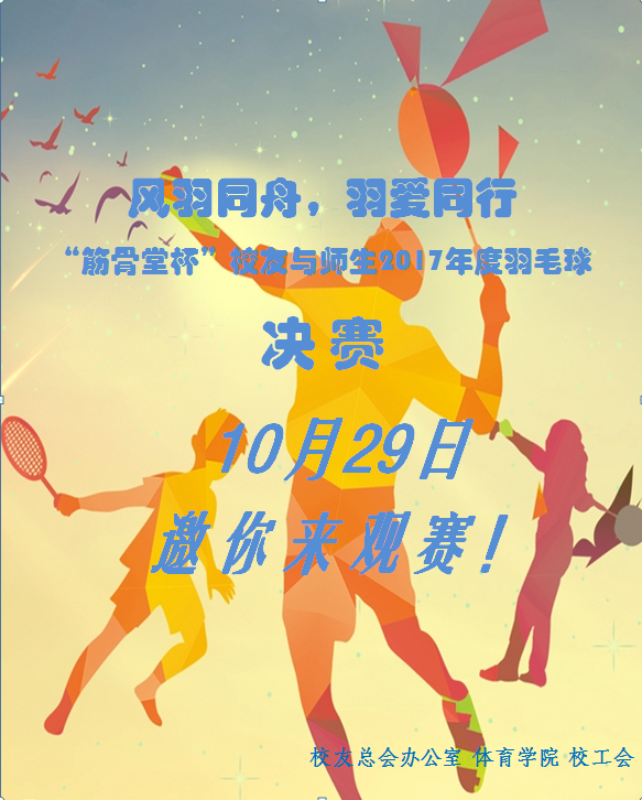 为凝聚校友感情,加强校友与学校在校师生之间的交流,学校决定于10月29日(星期日)上午9:00在未央校区体育馆举办风羽同舟,羽爱同行,“筋骨堂杯”校友与师生2017年度羽毛球决赛。