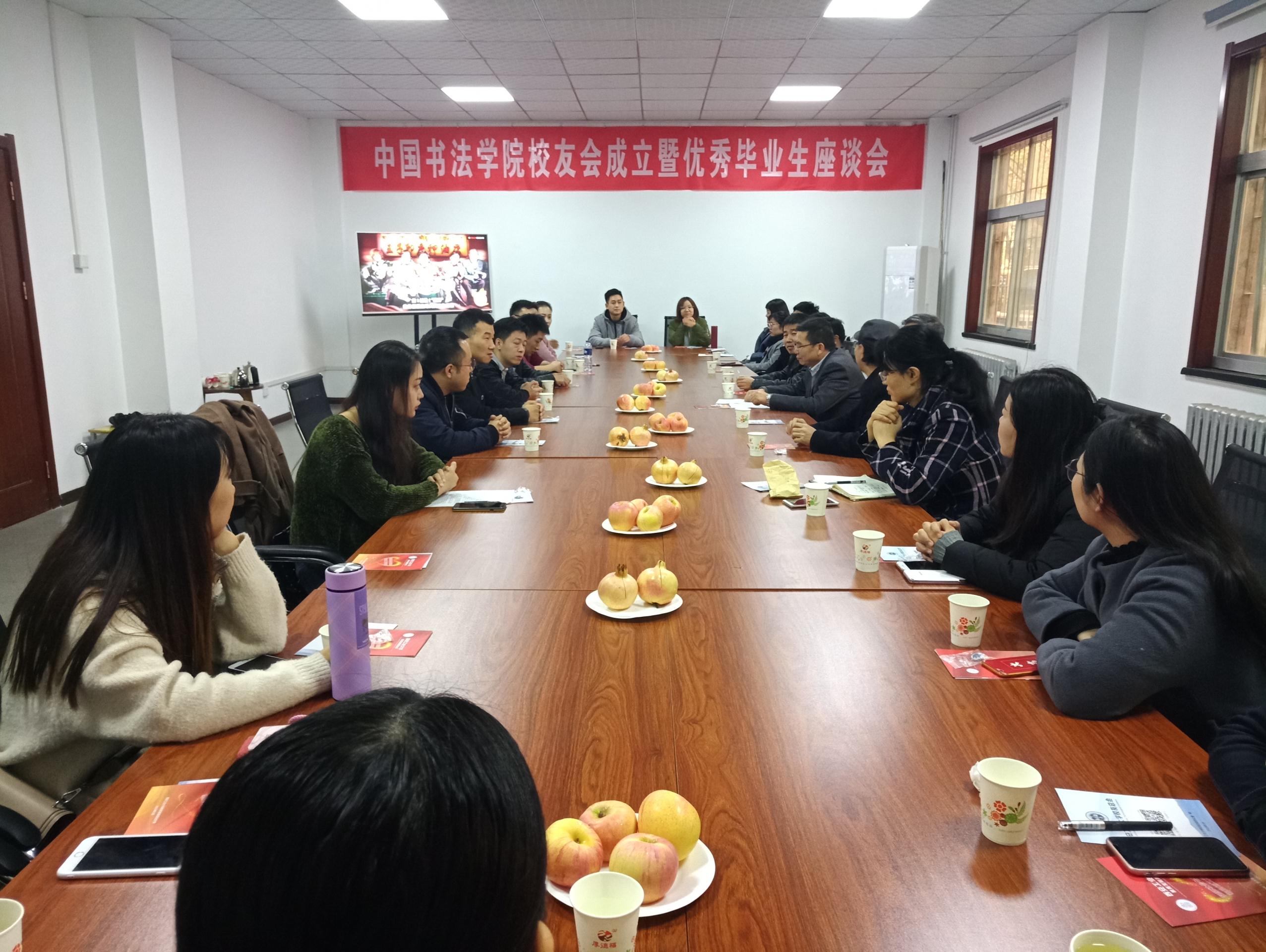 魏明明代表学校校友总会宣读了中国书法学院校友分会成立批复及分会建议名单。分会理事长、书法学院院长于唯德作表态发言,他表示大家推选他担任中国书法学院校友分会首届理事长,深感责任重大,必将不负重托,和理事会各位成员一起积极做好校友会工作,把校友会建设成为连接母校与校友的桥梁,建设成为真正的校友之家。刘建勋在讲话中表示,中国书法学院以传统书法文化以及文创产品为突破口,探索与“一带一路”沿线国家人文交流新模式,促进了中国传统文化的交流,提升了学校的社会影响力。刘建勋介绍了各地校友分会的基本情况,希望在座校友和全国各地校友会加强联系,为校友和校友、校友和母校搭建平台,共谋发展。最后,与会30多名校友进行了座谈。