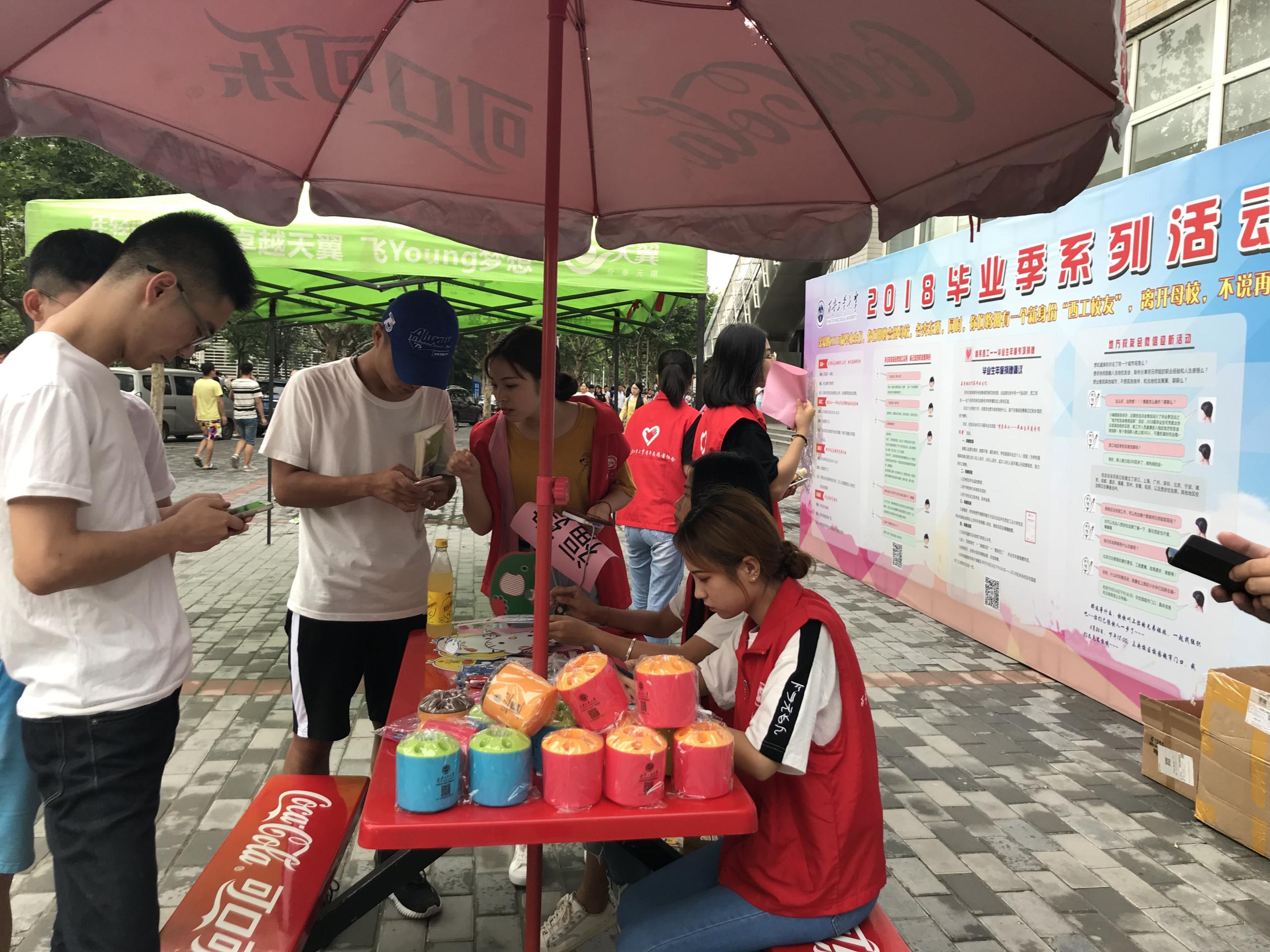 6月26日下午,毕业生年度专项捐赠纪念品发放和地方校友会微信迎新活动在校园超市门口举行。